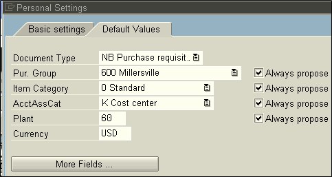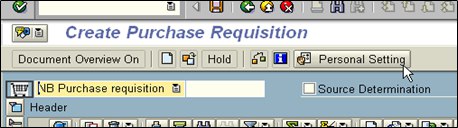 In the SAP system, go to ME51N - Create a new Purchase Requisition.Click the Personal Setting icon.