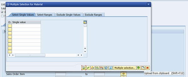 Figure 5 shows that you can enter a single value of materials ("Single value") or a range of values. You can also exclude individual materials or a range of materials while running any report in SAP by referring to the different tabs available for this purpose. If you have copied material data from another source, such as Microsoft Excel, and want to paste it into your SAP system, then you can choose "Upload from clipboard" and the system will paste all of the individual values.