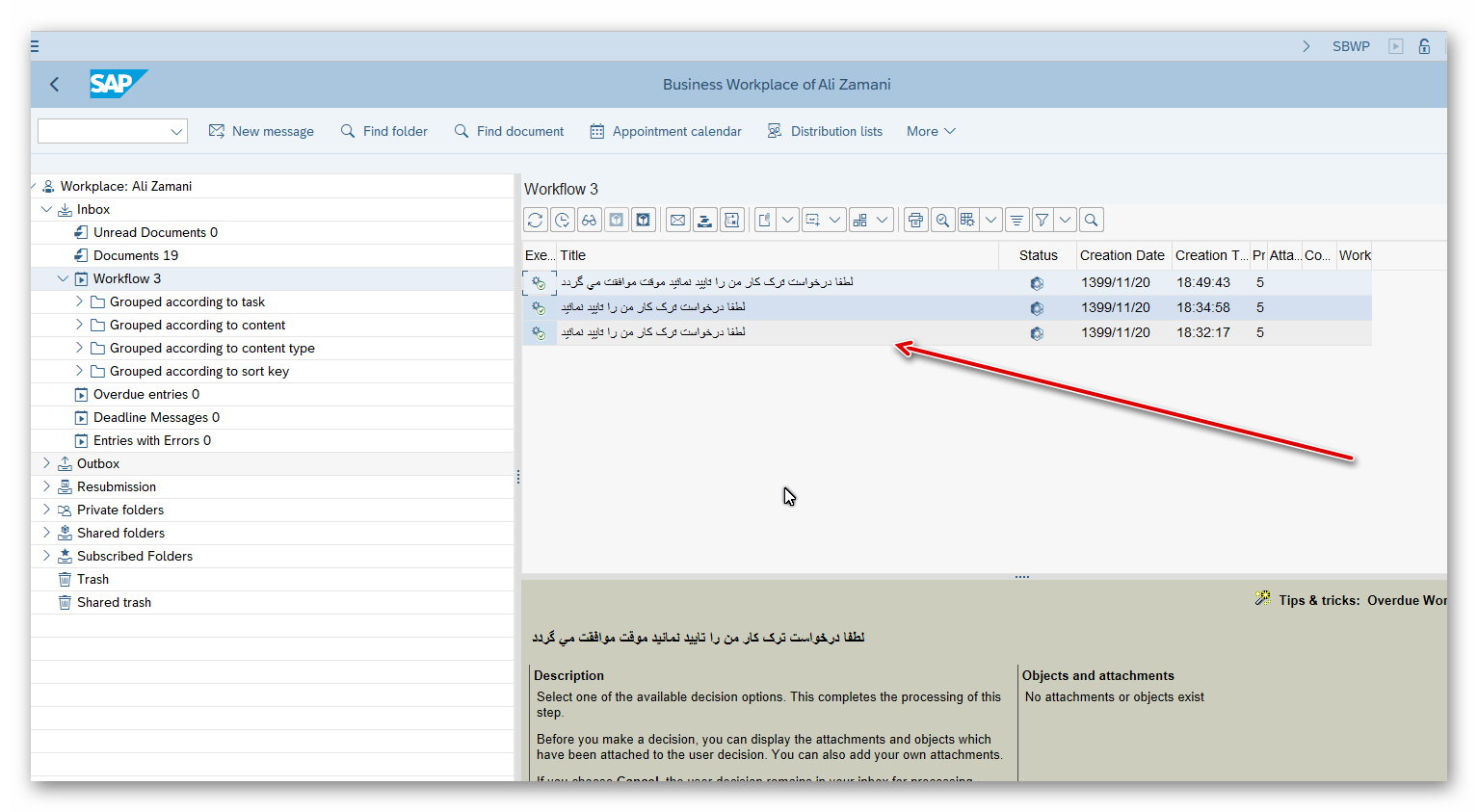 برای اینکه کاربران،کارهای تعریف شده توسط ورک فلو را دریافت کنند و انجام دهند پیامی به آنها ارسال می شود که معمولا شامل اطلاعاتی است در مورد کاری که باید انجام شود..این پیامها در workplace قابل مشاهده است.کاربر با مشاهده عنوان و شرح ورک آیتم،کااری را که باید انجاام شود تشخیص داده و کافی است که روی دکمه execute کلیک کند تا وارد برنامه یا ترنزکشن مربوطه شود،بعد از اتمام کار،ورک آیتم از لیست کارهای کاربر خارج شده و ورک فلو یک مرحله به جلو خواهد رفت.